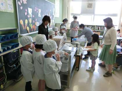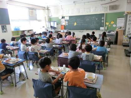 今日は1年生も初めての給食。給食ボランティアの保護者の皆様にもご協力いただき、準備の仕方をしっかりと教わり、配膳が終わりました。さあみんなで「いただきま〜す!」みんな小学校最初の給食をおいしそうに食べていました。これから毎日、残さずモリモリと食べられるとよいですね!