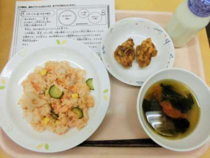 今日は、あけぼのずし、牛乳、鶏肉のから揚げ、大根と小松菜のすまし汁です。