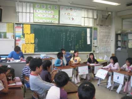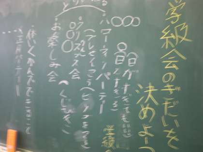 学級会の授業でした。子どもが司会となって議事を進めます。子どもたちは、友達の話を聞いて、よく意見を言います。意見を言える子が育っています。
