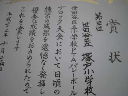 10月24日、日曜日、PTAの6ブロックのバレーボール大会がありました。見事3位に入賞できました。塚戸小PTAバレー部にとって久しぶりの快挙でした。おめでとうございます。