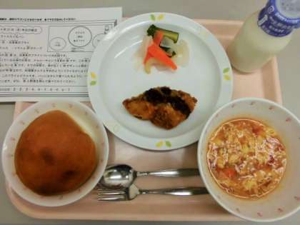今日は、スライス入り丸パン、牛乳、白身魚のフライ、ピクルス、トマトと卵のスープです。