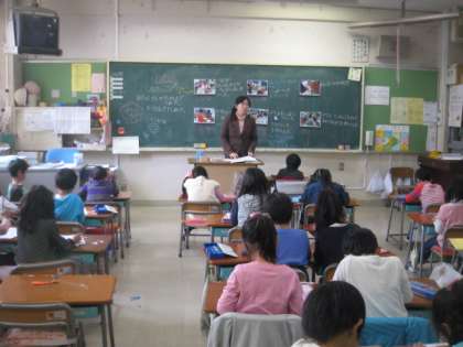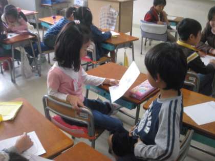生活科の授業でした。2校時に2年5組を招いて「ドングリ祭り」を行いました。1年5組の子供たちが、ドングリを材料にして作った遊びコーナーに、2年5組のお兄さんやお姉さんが来て一緒に遊びました。そして、4校時に自分たちの遊びを振り返って、よくできた自分たちをほめ合いました。