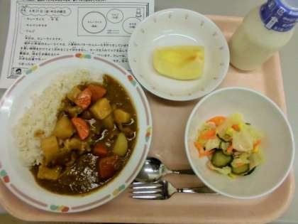 今日は、カレーライス、牛乳、キャベツサラダ、りんごです。