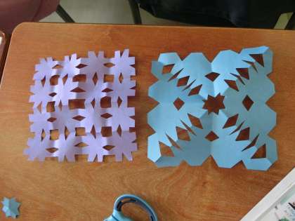 今日の1年生は図工でハサミを使った飾り作りをしていました。1回折り、2回折り、中にはもっと折ってハサミで切り、細かな飾りを作る子までいました。この飾りの作り方は開いてみたときにどんな形になるのかも楽しみで、「こんなのできたよ!」と嬉しそうに見せてくれました。安全に楽しく学習ができました。