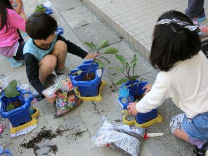 気温の変化が激しいですが、ようやく穏やかな天気になりました。これから夏野菜がぐんぐん育つ季節になりますね。今日は2年生が生活科「野菜を育てよう」の学習で、苗から植木鉢に植え替えをしていました。なす、ピーマン、ミニトマトそれぞれの野菜が元気に育ち、たくさん収穫できるといいですね。2年生みんなで、これからしっかりと観察し、お世話をしていきます。