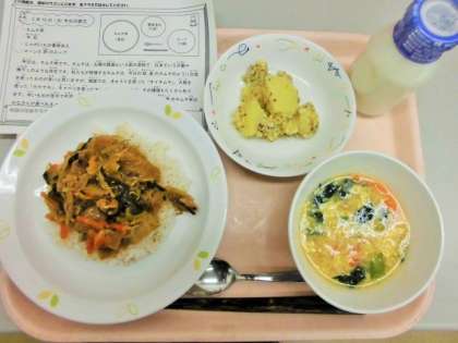 今日は、キムチ丼、牛乳、じゃがいもの香味あえ、コーンと卵のスープです。