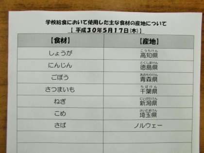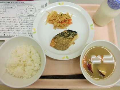 今日は、ごはん、牛乳、魚のごまだれかけ、はりはり漬け、五目汁です。