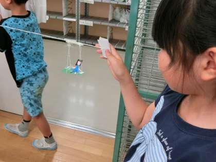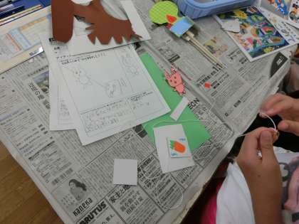 4年生の図工は、「パックパク」という学習をしています。切ったりはったりするだけではなく、動かして遊ぶおもちゃを作るために、仕組みを考えなければなりません。たくさん考えて設計図を描き、それをもとに一生懸命に作っていました。思い通りに動くと歓声が上がっていました。とっても楽しく学習していました。
