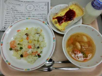 今日は、ピラフ、牛乳、スペイン風オムレツ、白いんげん豆の田舎風スープです。