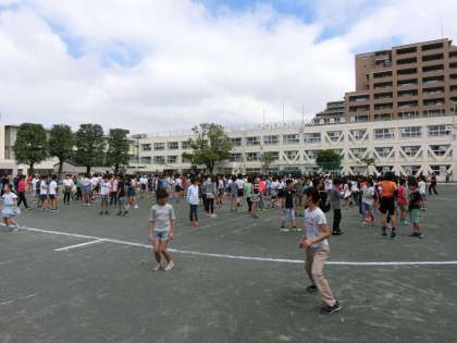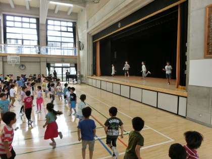 今日の朝活動は「ステップダンス集会」でした。体育委員の子たちが中心となってダンスを覚え、まず初めにお手本となって踊ってくれました。これから1か月練習し、6月には発表会も開かれます。みんなで楽しく踊り、たくさん体を動かして体力もつけたいですね!