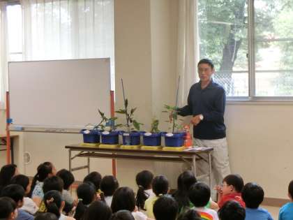 先日もご紹介しましたが、2年生は生活科の学習で野菜作りをしています。今日は、川勝農園の川本さんにお越しいただき、野菜の育て方についてとっても丁寧に教えていただきました。中には「枯れた葉は水をあげて育てていればまた緑の葉になる」と思っていた子もいて、「枯れた葉はとるんだ!」と新鮮な驚きを感じたようです。今日も地域の方々のご協力により、充実した学習となりました。ありがとうございました。