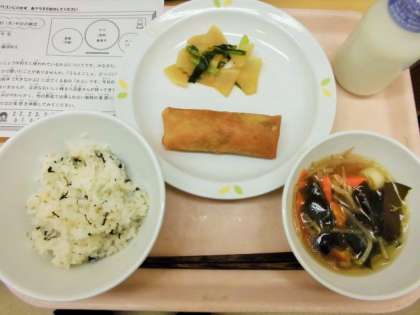 今日は、菜飯、牛乳、春巻き、かぶのレモンじょうゆあえ、わかめスープです。