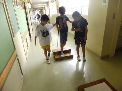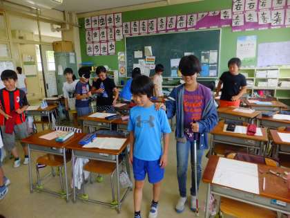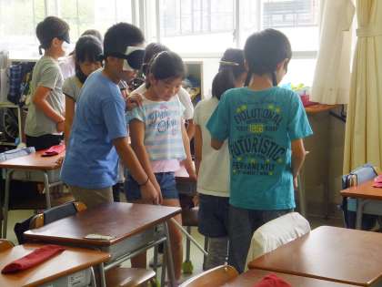 5月25日(金)に総合の学習「みんなで考えよう よりよいくらし」の中で、アイマスクをして視覚障害の体験を行いました。子供たちは、アイマスクと補助者に分担して教室の中を歩いたり、廊下に設置した2段の階段などを上り下りしたりしました。目が見えない状態では、白杖や補助者がどれだけ大切であるかに気付き、振り返りをしていました。