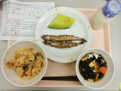 今日は、とりめし、牛乳、ししゃものごま焼き、若竹汁、メロンです。