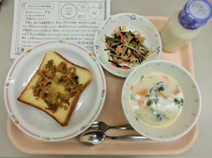 今日は、きんぴらトースト、牛乳、ひじきとツナのサラダ、小松菜のクリームスープです。