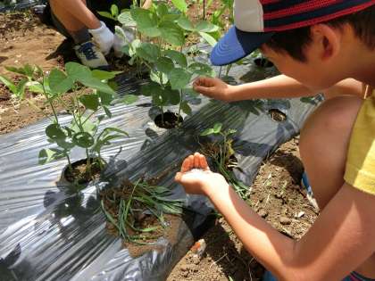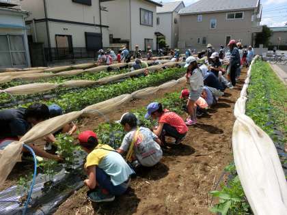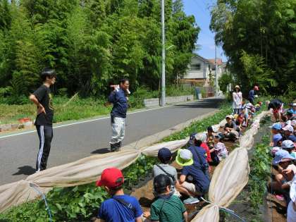 今日は3年生の農業体験がありました。今日の作業は大豆畑(枝豆)の雑草取りと追肥の作業です。今3年生は理科で昆虫などの生き物の学習もしているので、質問コーナーでは、農作業の話ではなくカマキリの話やクモの話なってしまうところが、まだまだかわいい3年生です。植物を育てるのだからその周りには虫も生息することを実感しました。川勝農園さんや保護者のボランティアの皆様のご協力によって、素晴らし体験ができました。天気が良く、とっても暑い中でしたが、子どもたちは真剣に取り組むことができました。地産地消といいますが、せたがやそだちの野菜を食べて健康に生活したいですね。