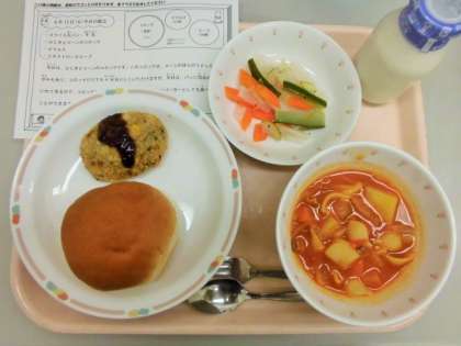 今日は、スライス丸パン、牛乳、ひじきとコーンのコロッケ、ピクルス、ミネストローネスープです。