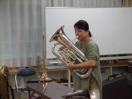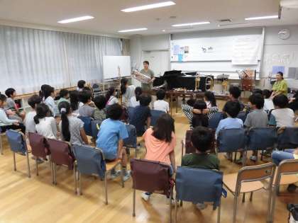 今日は『おたまじゃくしの会(保護者)』の皆さんの協力によって、金管楽器体験をすることができました。大きな楽器から小さな楽器まで、高い音の出る楽器から低い音の出る楽器まで、様々な金管楽器を体験させていただくことができ、子どもたちも大満足でした。最後には、3つの楽器を使った生演奏もあり、大変貴重な時間を過ごすことができました。