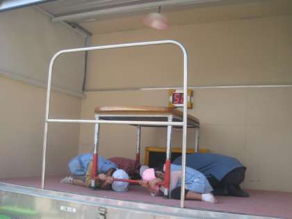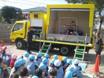 幼稚園の年長さんは、起振車体験をしました。地震の揺れを感じ、その怖さを実感しました。よい体験でした。