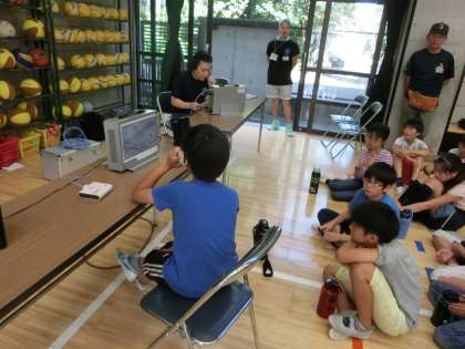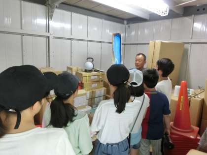 サバイバルキャンプの訓練は、(1)電話通報訓練 (2)止血法訓練 (3)担架訓練 (4)防災倉庫見学・説明 (5)避難所簡易トイレ (6)消火器訓練6種類です。グループごとに順番に体験しました。