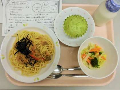 今日は、ツナおろしスパゲティー、牛乳、ブロッコリーのサラダ、東京蒸しパンです。