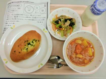 今日は、ガーリックフランス、牛乳、ビーンズシチュー、きのこと小松菜のソテーです。