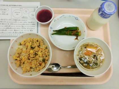 今日は、4色そぼろ丼、牛乳、オクラのおかか和え、七夕汁、七夕ゼリーです。
