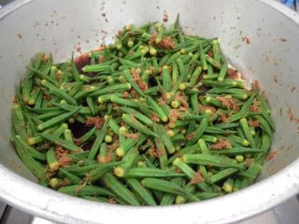 今日は、ひと足早い七夕の行事献立です。今回は、ぞれぞれの料理で七夕を表現しました。断面が星型をしているオクラもおかか和えにして取り入れました。上から下まで丸ごと食べることができるよう、かたい部分も包丁で取り除いています。