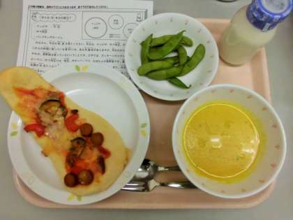 今日は、ナンピザ、牛乳、ゆで枝豆、パンプキンポタージュです。