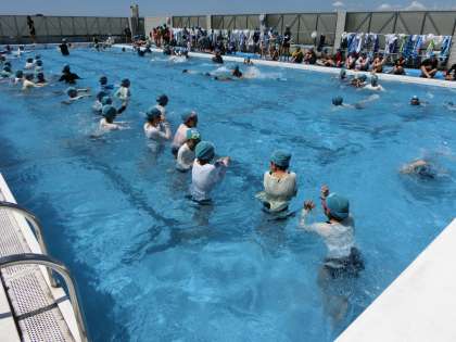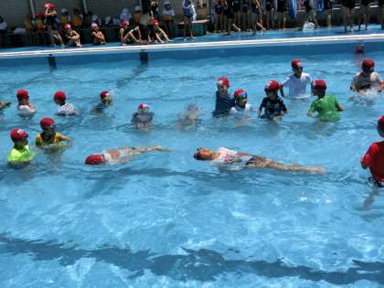 今日はとても天気が良く、2年生と5年生で着衣泳の学習がありました。水着で泳ぐ時と、服を着たまま泳ぐ時を比べると、服を着ている時は、大変泳ぎ辛くなることを体験することができました。服に空気を入れたり、仰向けになったりしながら、何とか浮こうと頑張っていました。これから海や川に出かけることも多くなる季節です。万が一の時に備えての学習となりました。