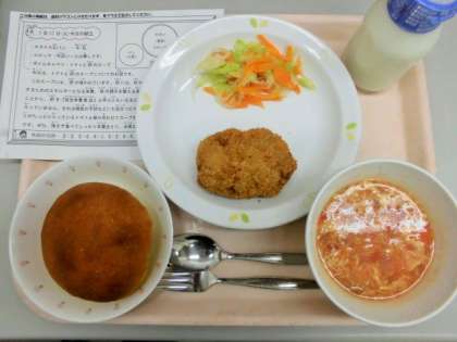 今日は、丸パン(スライス入り)、牛乳、コロッケ、ボイル野菜、トマトと卵のスープです。