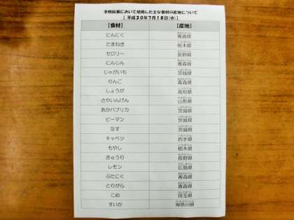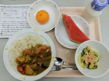 今日は、夏野菜カレーライス、牛乳、ビーンズサラダ、セレクトくだもの(すいか・冷凍みかん)です。