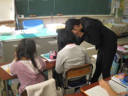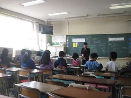 4年1,2組を3つのクラスに分けて、少人数でやる授業でした。益村先生のクラスは、基礎的なことをじっくりやるコースです。20人弱の少ない人数なので、一人一人に対してきめ細かな対応ができ、子供たちは確実にできるようになります。それが算数の少人数のよさです。