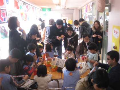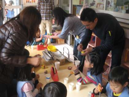 年少さんは、「親子で作ってあそぼう」でした。ちょっと難しいおもちゃづくりに挑戦します。お父さんやお母さんが手伝ってくれます。できたら、一緒に遊びます。共に作って遊ぶ喜びを感じたひと時でした。