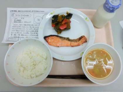 今日は、ごはん、牛乳、魚の塩麹焼き、夏野菜の南蛮かけ、冬瓜のみそ汁です。