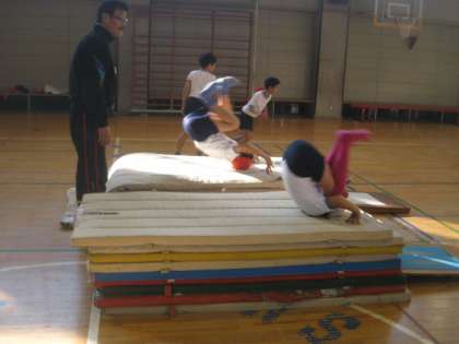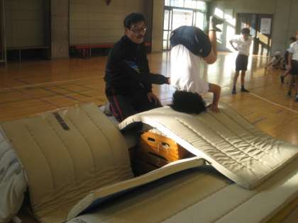 体育で台上前転をしていました。最初の時間です。前転のやり方を復習し、台上前転の仕方を教えてもらい、挑戦にします。初めてなので、安全に配慮した設定で、先生が補助して行います。楽しく意欲的に行っていました。
