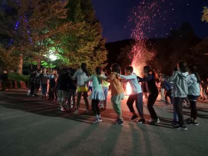 高く上がる炎を囲み、学年全体でレクリエーションを楽しんでいます。