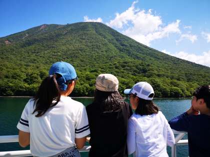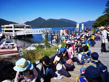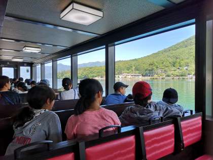 遊覧船に乗り、さかなと森の観察園を目指します。