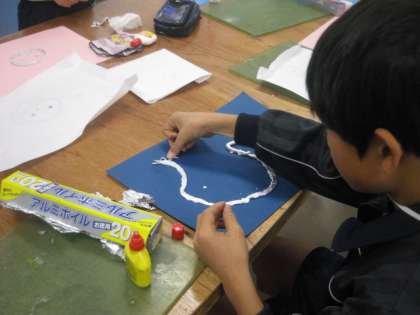 4年生の授業でした。「アルミホイルで絵をつくろう」です。アルミホイルをねじって形にしていきます。子供たちの発想がいかされます。アルミホイルの手触りを感じます。楽しみながら作っている子供たちでした。