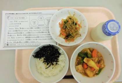 今日は、ごはん、ひじきのふりかけ、牛乳、じゃがいものそぼろ煮、カリじゃこサラダです。