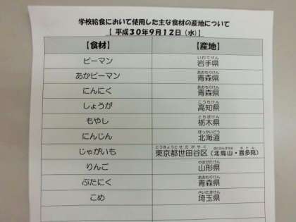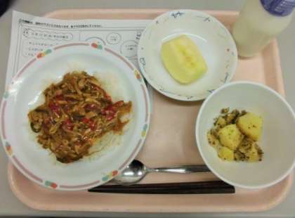今日は、チンジャオロースー丼、牛乳、じゃがいもの香味あえ、りんご(サンつがる)です。