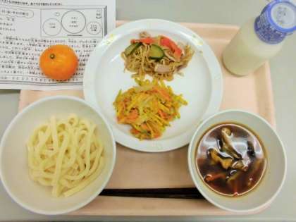 今日は、冷やしうどん、牛乳、夏野菜のかきあげ、中華風ごまだれかけ、冷凍みかんです。