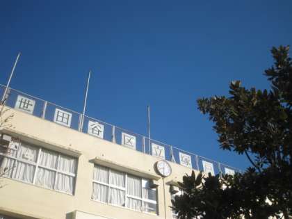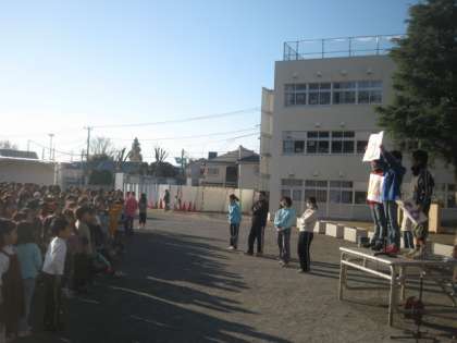 真っ青な青空の下、朝の校庭で、児童集会が行われました。年末にちなんだクイズを出す、集会委員会が行うゲーム集会でした。子どもたちは、みんなで楽しみました。