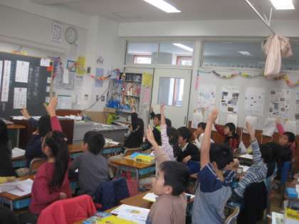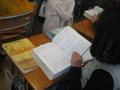 国語の授業でした。漢字の訓読みと音読みの学習です。辞書を使って読み方を調べます。子どもたちは、一生懸命手を挙げて発言します。意見をよく考えて言っています。全員発言できた45分の授業でした。