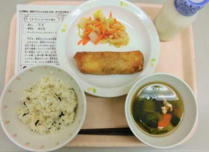 今日は、菜飯、牛乳、春巻き、ラーパーツァイ、チンゲン菜としめじのスープです。