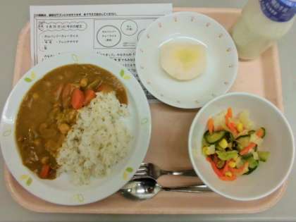 今日は、ガルバンゾーカレー、牛乳、フレンチサラダ、梨です。
