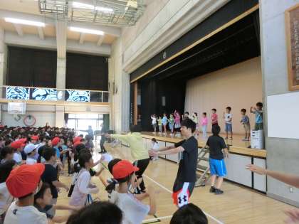 今年の運動会では、応援にも力を入れていくことを以前にお伝えしました。そこで、今日は各学年の団体競技がどのような競技なのかを紹介し合って、全校で応援していこうという趣旨の集会が開かれました。一番かわいかったのは1年生。おしりたんていの曲に合わせて「ふりふり玉入れ」の団体競技を行います。みんなでお尻をふりふり。「2年生から6年生のみなさんもやってください!」の声かけに、今日は1000人でお尻をふりふりしました。当日も1年生の競技中、全校みんなで踊りながら応援します。