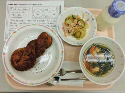 今日は、ココアあげパン、肉団子入り春雨スープ、ハムと大根のサラダです。