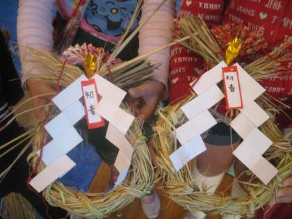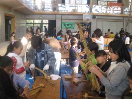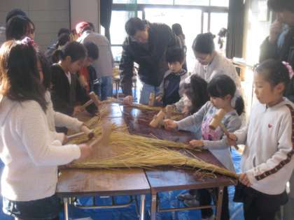 保護者の方に教えてもらって「輪飾り」を作りました。わらを湿らしてたたき、縛りながら丸めていきます。そこに、正月の飾りをつけて出来上がります。正月に飾れる立派な輪飾りができました。