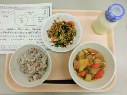 今日は、ゆかりごはん、牛乳、肉じゃがうま煮、乾物和えです。